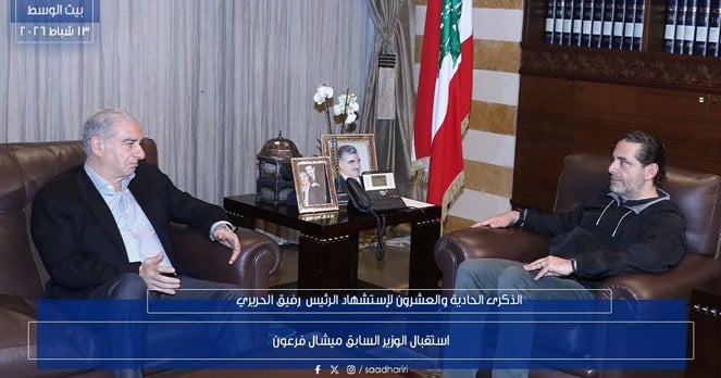 Lebanon فبراير 13, 2026 الحريري استقبل في بيت الوسط الوزير السابق ميشال فرعون استقبل الرئيس سعد الحريري، الوزير السابق ميشال فرعون في حضور المستشارين غطاس خوري وهاني حمود، وجرى بحث آخر التطورات